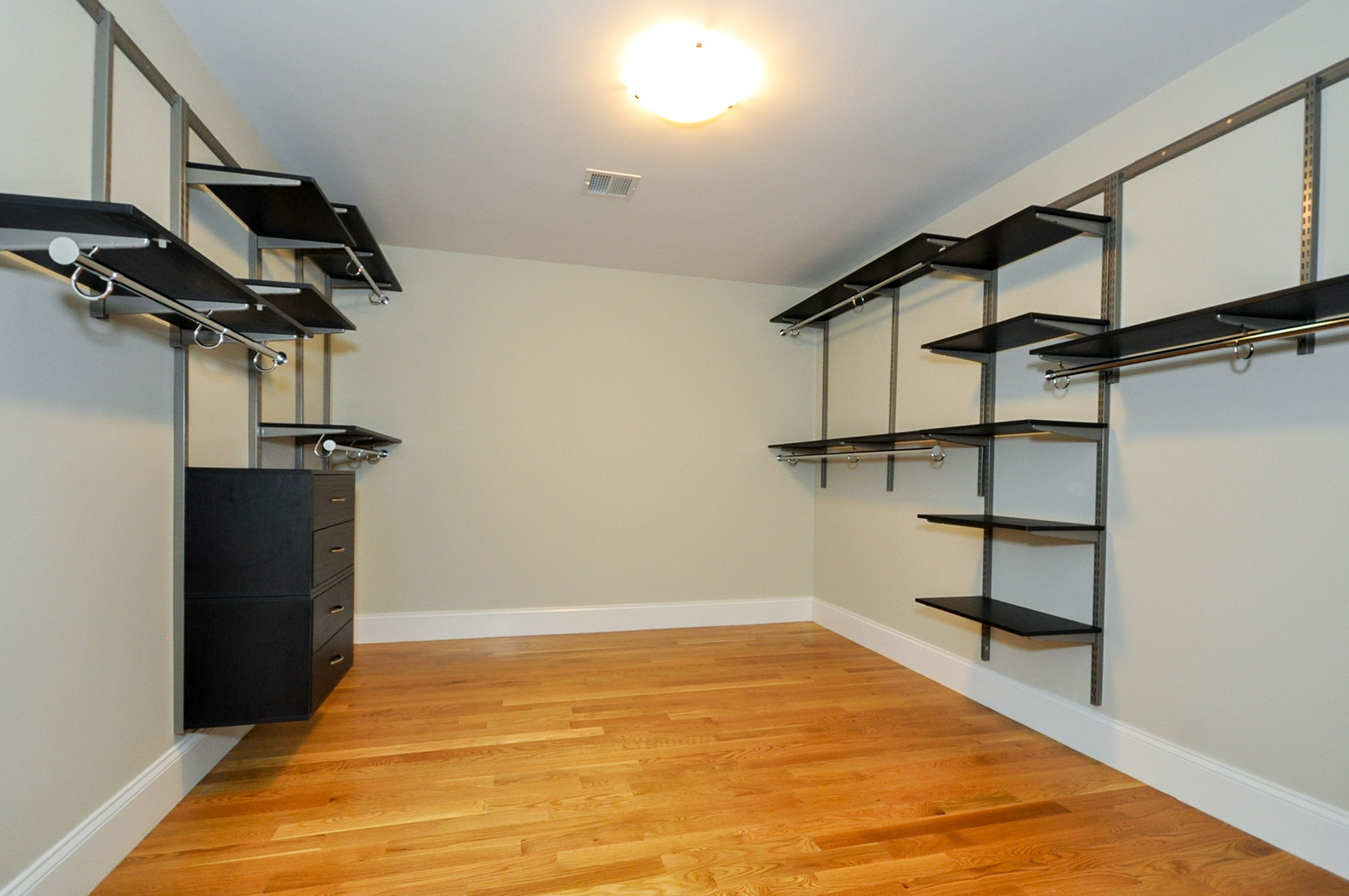 - A small storage closet is perfect for hanging clothing and storing hampers.